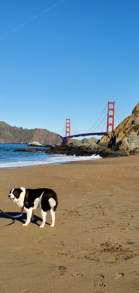 I got my people to take me to Baker Beach in San Francisco today to celebrate New Year’s Day. It’s not always easy to transfer my ideas into their heads telepathically—they have a lot of nonsense occupying their brain space—but I managed to get this one to register. Mom thinks it was her idea, but we know who has the brains in this operation.