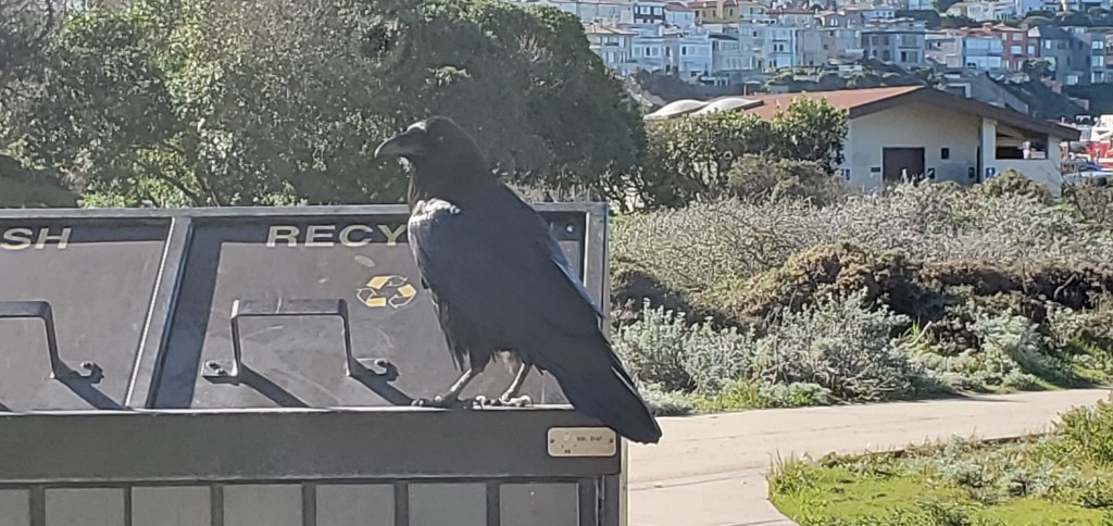 We had a picnic lunch and there was a raven on the nearby trash can who had eyes on our lunch. I wanted to chase him so bad I could taste feathers, but I was tied to the table. Humans sure know how to spoil the fun.