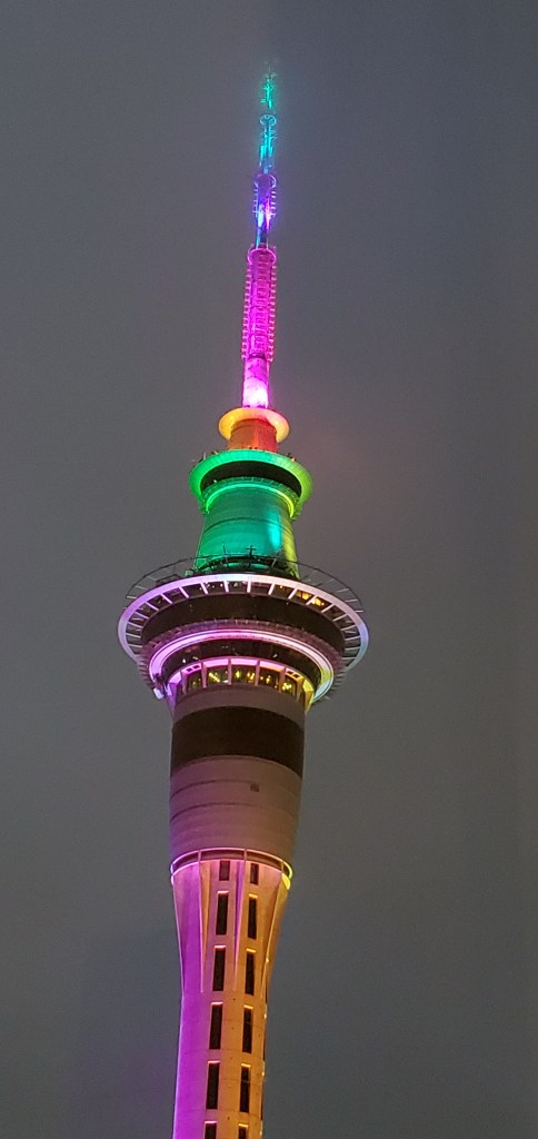 A bit bleary-eyed after a sleepless night on the plane, we were ready to call it a night. The next day we were driving to Matamata for our Hobbiton tour, so aimed to get our body clocks adjusted to New Zealand time. Optimistic fools! Back in our room, we were treated to a view of the Sky Tower wearing a rainbow of colors.